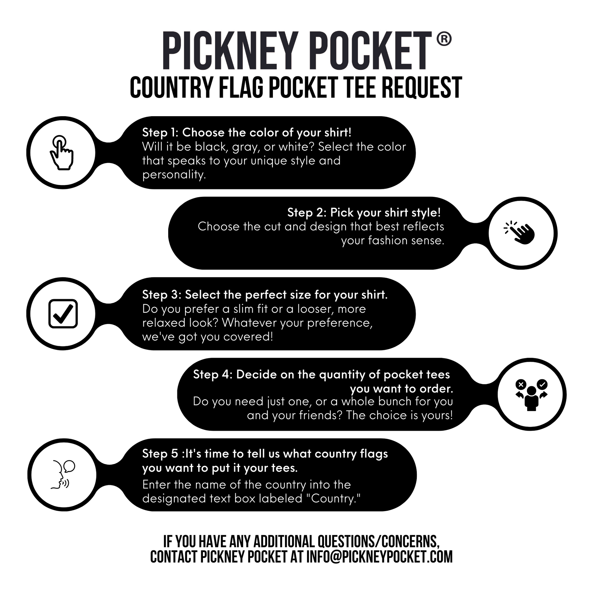 If you have any additional questions/concerns contact Pickney Pocket at info@pickneypocket.com